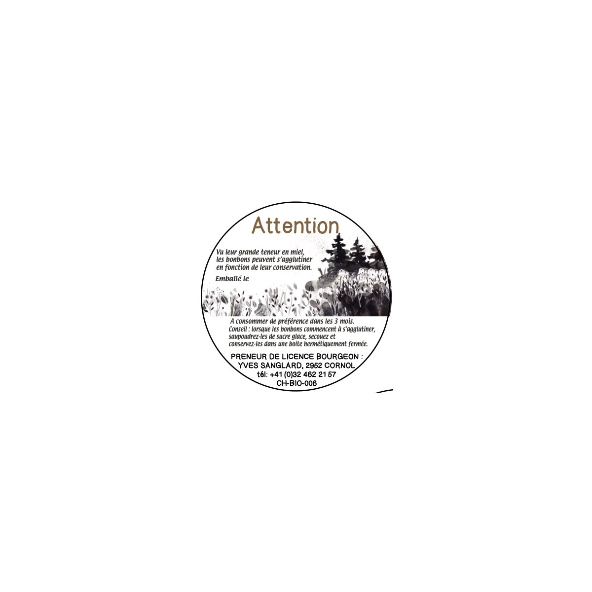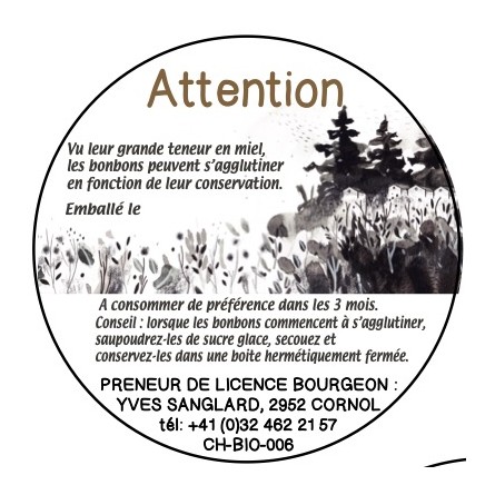 - Composition : miel d’Ajoie bio 42%, sucre bio, huile essentielle de menthe poivrée bio, acide citrique.
